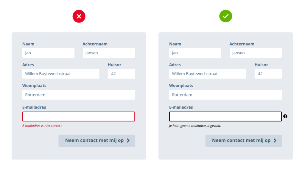 Jij kunt dit zelf doen door een vriendelijke tone-of-voice in de copy van een foutmelding. Hiermee voorkom je dat deze tekst intimiderend overkomt. Wij zullen hier altijd rekening mee houden door een passende kleur te kiezen voor een foutmelding. En aangezien wij toegankelijk ontwerpen, zorgen we er niet alleen voor dat foutmeldingen met een kleur worden aangeduid, maar ook altijd met een vorm. Dit doen we bijvoorbeeld door een icoontje toe te voegen aan de foutmelding. Op deze manier zorgen we ervoor dat bezoekers van je website met een visuele handicap, zoals kleurenblindheid, de foutmeldingen óók kunnen zien.