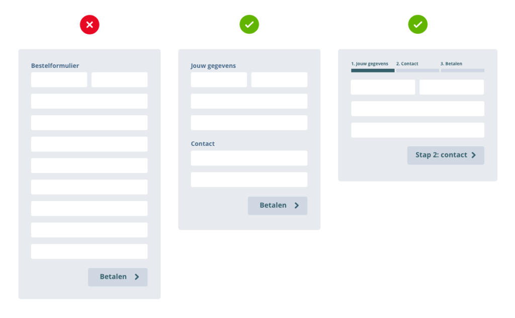 Ook kan het waardevol zijn om je formulier op te breken in stappen. Dit is zeker geschikt voor de meer complexe formulieren. Denk bijvoorbeeld aan een bestelformulier. Door informatie op te breken in behapbare ‘chunks’ zorg je ervoor dat je bezoekers de gegeven informatie beter kunnen verwerken. Daarnaast creëer je een extra motivatie voor je bezoekers om het formulier af te ronden. Doordat zij telkens een stap invullen en verder gaan in het formulier, motiveer je hen om het formulier af te ronden. Dit heet het ‘endowed progress effect’ en houdt in dat wanneer je (kunstmatig of niet) voortgang creëert voor een bezoeker, hij of zij meer gemotiveerd is om de actie af te maken. Niemand wil namelijk zijn voortgang kwijtraken.
