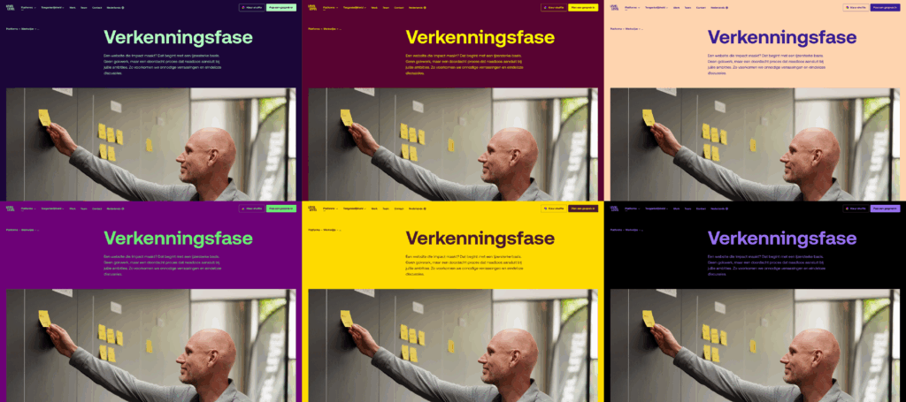 Veel mensen hebben de misconceptie dat toegankelijkheid saai is. Dat het alleen gaat over beperkingen, regels en grijs design. Maar toegankelijkheid draait om mensen en mensen zijn allesbehalve saai. Op onze site laten we dat zien met een speelse kleurenwissel. Met één klik verander je het hele thema van de site naar een andere, volledig toegankelijke kleurcombinatie.