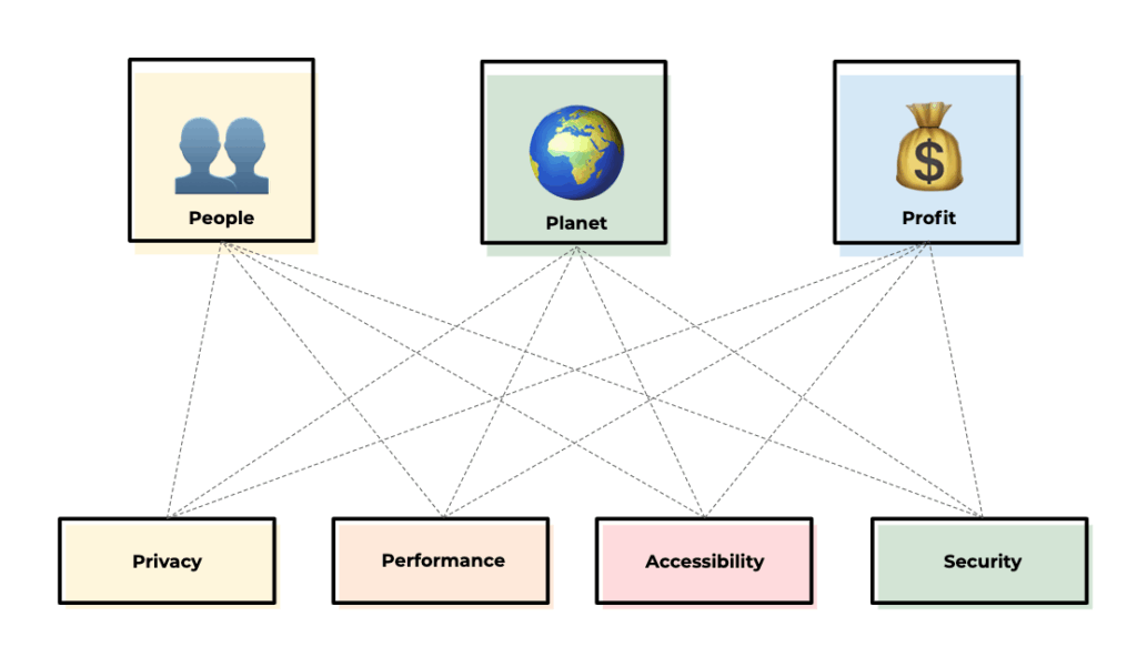 Deze standaarden hebben wij verdeeld in vier essentiële pijlers: Performance, Security, Privacy en Accessibility. Daarbij hebben we in kaart gebracht wat deze standaarden voor gevolgen hebben voor People, Planet en Profit.