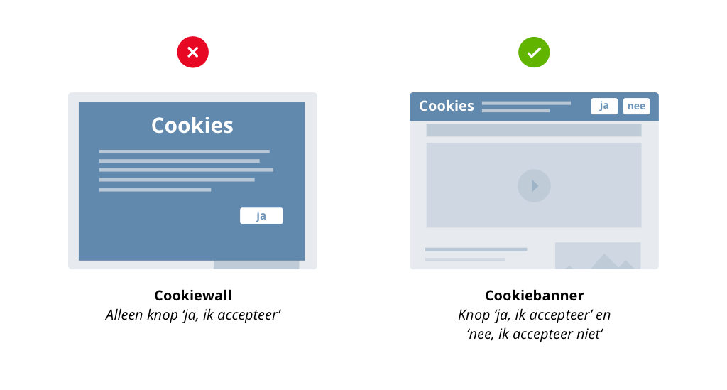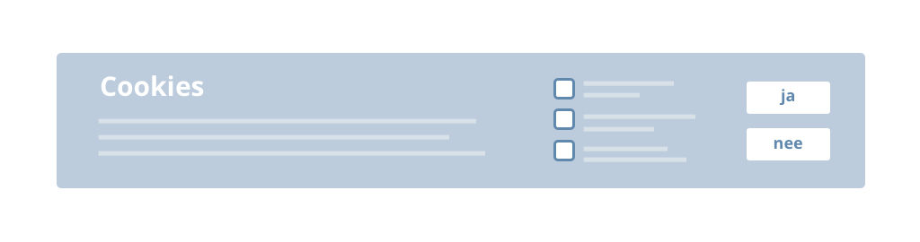 - Ga na welke cookies je op je website plaatst. Denk hierbij ook aan cookies van derden die bijvoorbeeld geplaatst worden doordat je YouTube video’s op je website inlaadt. Ga vervolgens na of je alle cookies wilt plaatsen. Als je analytische cookies plaatst en deze deelt met derden en/of als je tracking cookies plaatst, zet dan een cookiebanner in die dergelijke cookies pas toestaat na akkoord van de bezoeker. In het kader van de transparantie (en de ‘basistoegang tot […] de digitale economie’ zoals in het ePrivacy wetsvoorstel staat) raden wij het inzetten van een cookiewall waarmee de website geblokkeerd wordt af. Ga je voor een cookiebanner? Onderzoek dan of deze AVG compliant is. Dit betekent onder andere dat je moet kunnen aantonen dat de betrokkene toestemming heeft gegeven voor het plaatsen van de cookies. Er zijn tools die dit voor jou bij kunnen houden. We adviseren je daar graag over. In een andere blogpost in deze reeks gaan we dieper in op de gevolgen van de AVG op het plaatsen van cookies.