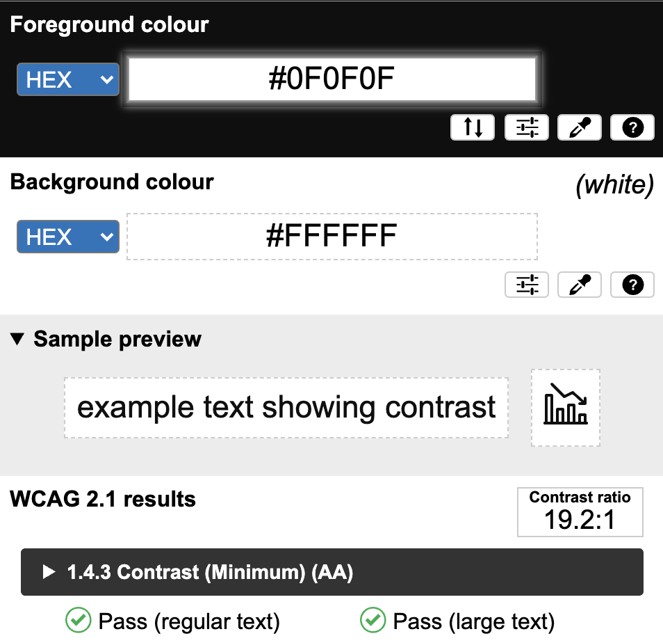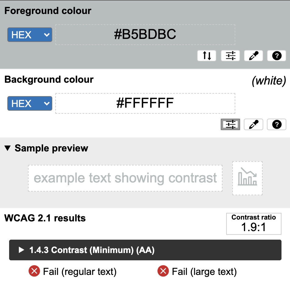 In het voorbeeld zien we dat lichtgrijze tekst (#B5BDBC) op een witte (#FFFFFF) achtergrond een contrastverhouding van 1,9:1 heeft. Dit zorgt ervoor dat WCAG criterium 1.4.3 faalt. In de sample preview zie je dat deze tekst slecht leesbaar is. In het tweede voorbeeld zie je dat een zeer donkere tekst (#0F0F0F) op een witte achtergrond een contrastverhouding van 19,2:1 heeft. Dit zorgt ervoor dat aan WCAG criterium 1.4.3 wordt voldaan.