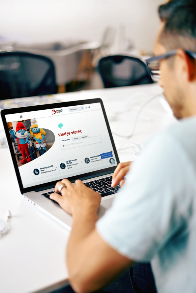 Foto van man achter laptop met de website van Brussels Airport op het scherm.